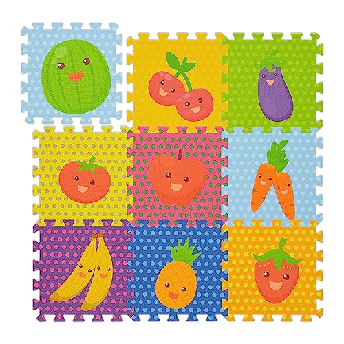 Relaxdays Pusselmatta frukt, 9-delad lekmatta, föroreningsfri, EVA-skum, barnrum, 86 x 86 cm, färgglad, orange, blå, lila