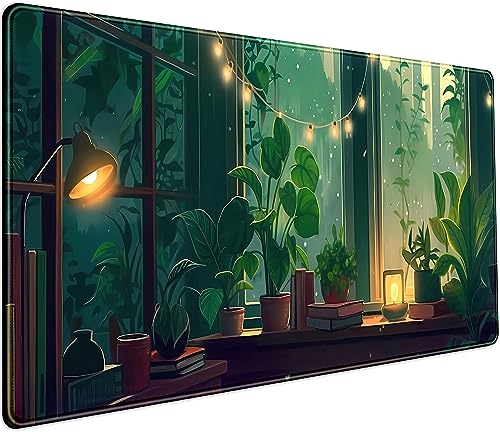 Söt Grön Lofi Skrivbordsmatta Växter Musmatta Anime Skog Estetisk Natur Skrivbordsdyna, XXL Stor Spel Utökad för PC Laptop Tangentbord Kvinnor Kontorsdekor Flicka Lekmatta 80 x 40 cm