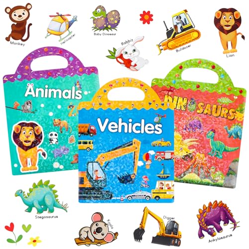 Klistermärkesbok för barn, återanvändbar klistermärkesbok, dinosaurie, fordon, zoo, klistermärken för barn, 3–6 flickor, pojkar, pedagogisk pedagogisk pedagogisk leksak (3-pack – dinosaurie, fordon