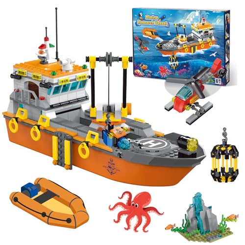 kiothdre City Ocean Explorer skepp byggsats, rolig leksak utforskning båt byggklossats med LED-lampor, helikopter, ubåt, bur, födelsedag för 6, 8, 10, 12 år gamla pojkar flickor barn