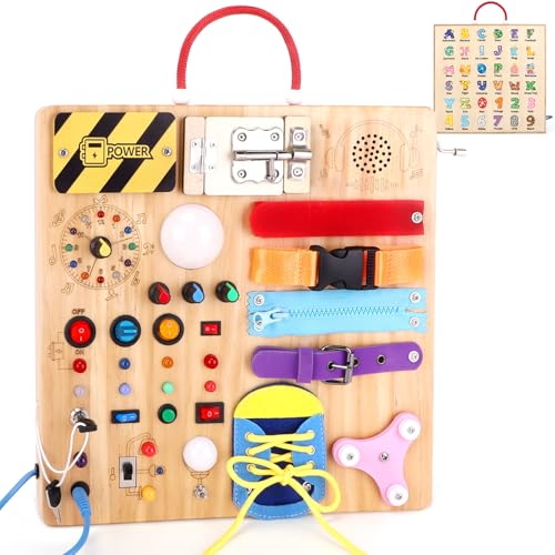 23 i 1 Busy Board Montessori-leksak från 1 år Aktivitetsbräda Träleksak Med 15 strömbrytare, 26 LED-lampor, speldosa, lås, snören, dragkedja för 1 2 3 år pojkar och flickor