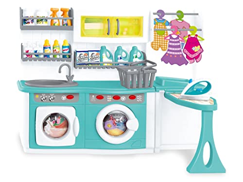 Teorema Giocattoli 67061 – tvättstuga leksak för barn med riktiga ljudeffekter och ljuseffekter, dörrar att öppna, med tvättmaskin, strykjärn, tvättmedelsbehållare och kartong kläder