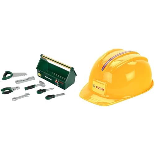 Theo Klein 8573 Bosch verktygslåda | Verktygssats i 7 delar | Tålig låda med praktiskt bärhandtag | För barn från 3 år & Theo Klein 8127 Bosch bygghjälm | Leksakshjälm | Leksak för barn från 3 år