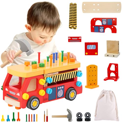 Dhnvcud Verktygslåda barn, arbetsbänk, Montessori-leksak från 2 3 4 år, träleksak, barnleksak, verktygslåda, pedagogiska spel, verktyg, 67 stycken, barngåva, pojke, flicka, 2–3 4 år