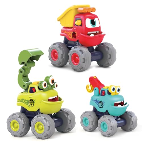 MOONTOY Billeksaker från 1 2 år pojke, gåva, 3 stycken monsterlastbilar leksaksbilar för 10 12 18 månader, leksaker fordon från 1 år friktionsfunktion, uppdragningsfunktion, present till 1:a