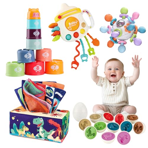 XAZASTOV 5 st baby Montessori-leksaker för 6 12 18 månader, present till 1 år gammal pojke flicka, baby näsdukslåda, dino matchande ägg, dra strängleksak, tandleksak, staplingsleksak