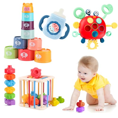 XAZASTOV Babyleksaker 6 till 12 månader – 4-i-1 Montessori-leksaker för spädbarn, sensoriska babyleksaker 12-18 månader tidigt lärande leksaker för pojkar flickor med formsorterare som staplar koppar