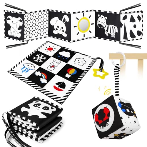 Aolso Svartvita sensoriska leksaker med hög kontrast, set med sensoriska leksaker, baby spädbarn nyfödd 0-3-6-9-12 månader, Montessori leksaker med bitring, skallra för bebisar sensorisk mjuk bok