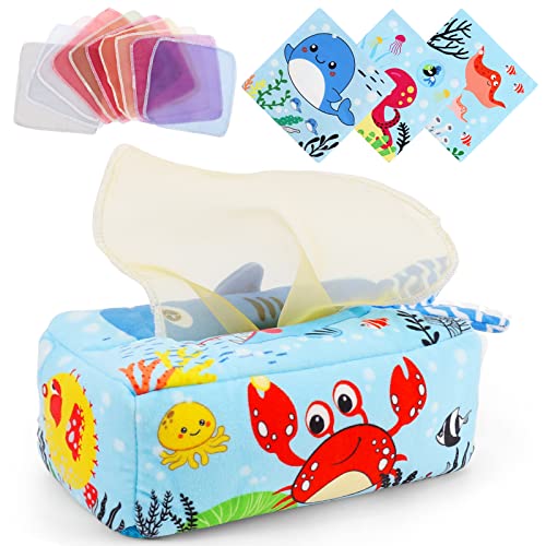 Babyleksak 6 månader, sensoriska leksaker för babyvävnad låda leksak med 3 fyrkantiga handdukar, 8 färgade gaszor, kontrastleksak, baby, present, pojkar, flickor, 3 6 9 12 månader, presenter till