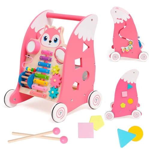 Babyskoter, trä baby promenadvagn med Montessori-leksaker, babyvandrare med gummidäck, 6 månader gammal pedagogisk leksak (ekorre)