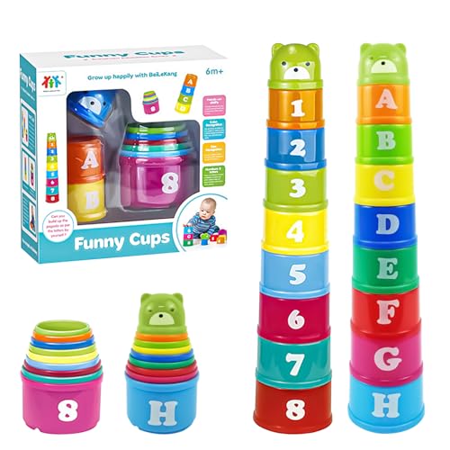 MOONTOY Stapelbara koppar, babyleksaker, 11 stycken stapelbara leksaker för 1-åringar, spädbarn, småbarn, pojkar och flickor, stapelbara badleksaker med siffror, bokstäver, mönster, pedagogiska leksaker för utveckling, gåvor för barn som är 1, 2 och 3 år