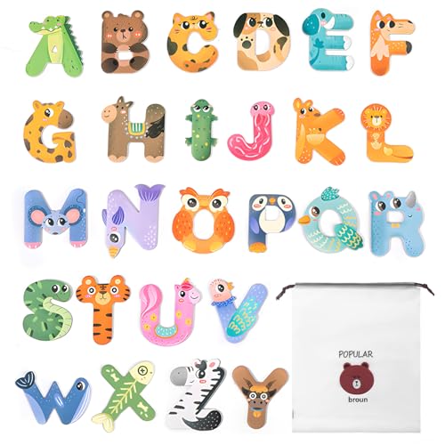 36 stycken färgglada magnetiska leksaker - bokstäver och siffror, tecknade djur, träkylskåp, stavning pedagogiska leksaker