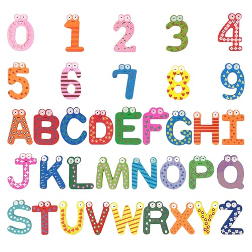 Magnetiska bokstäver och siffror i trä - magneter på kylen för barn - alfabetbokstäver och sifframagneter för barn - ABC och stavningslärande leksaker