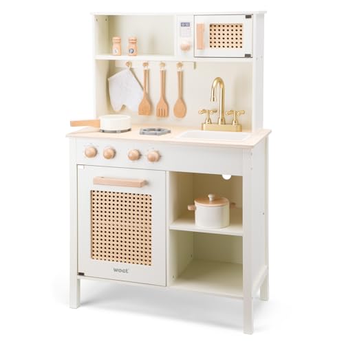 Barnkök i Trä, Lekkök i Trä för Barn, Leksakskök med Ljus och Ljud, Dockkök 82x80x25 cm, med Lekkökstillbehör, Litet kök, Leksaker för Barn Från 3 år och Uppåt, Vit