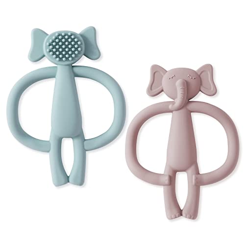 Vicloon Bitring för spädbarn, 2 st bitring elefant med praktiska handtag, Bitring leksaker, mjuk silikon, BPA-fri, naturlig kylbitring för tandsprickning, sensorisk bitring och greppleksak(blå grön)
