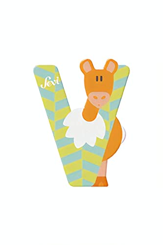 Sevi 83022 djur träbokstäver V Vikunja ca 10 cm, dörrbokstäver för barnrum, ABC pedagogiska leksaker av trä, pedagogiska leksaker för barn från 3 år, bokstaven djur, blå/gul