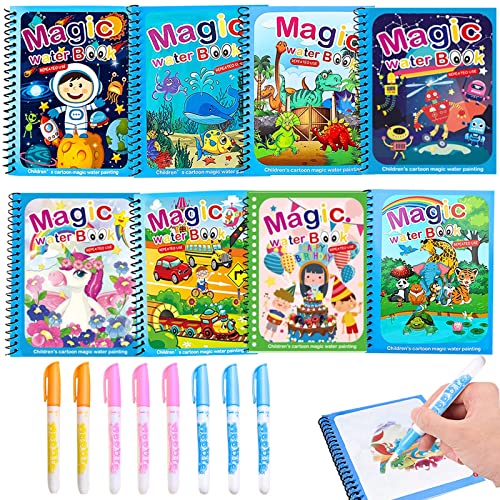 Seloxmcs 8 stycken målarbok, magisk vattenmålning för barn, magisk vattenbok, återanvändbar, med doodle-penna, vattenböcker, klotter leksaker, magiskt vatten, tavla, barn, teckning