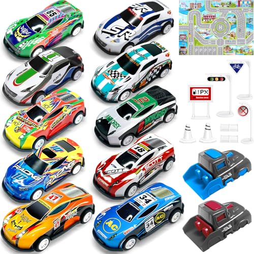 TOYABI 21 Matchbox, bilset, 10 st små billeksaker i metall, leksaksbilar med tändsticksstart/stadsmatta/förvaringsväska för 3-4 5 år gamla pojkar och flickor