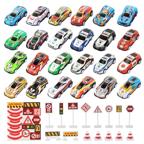 kayqbonke 24 stycken minibilset, 6,8 x 3,3 x 1,8 cm metall stunt leksaksbil med 15 barrikader, slumpmässig stil, metall små leksaksbilar kan användas som barnpresenter