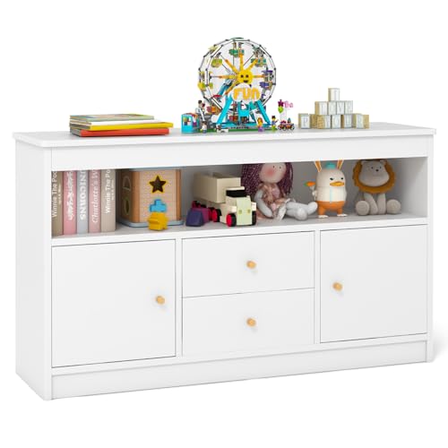 COSTWAY Leksaksskåp, barnhylla av trä, barnskåp med 2 lådor och 2 dörrar, leksaksförvaring, förvaringsskåp för barnrum, sovrum, 106 x 30 x 62 cm (vit)
