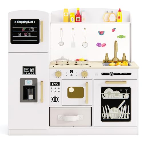 COSTWAY Barnkök med tillbehör, lekkök med skrivtavla glassmaskin, diskbänk, tyglåda och diskmaskin, leksakskök med upplyst mikrovågsugn för barn från 2 år