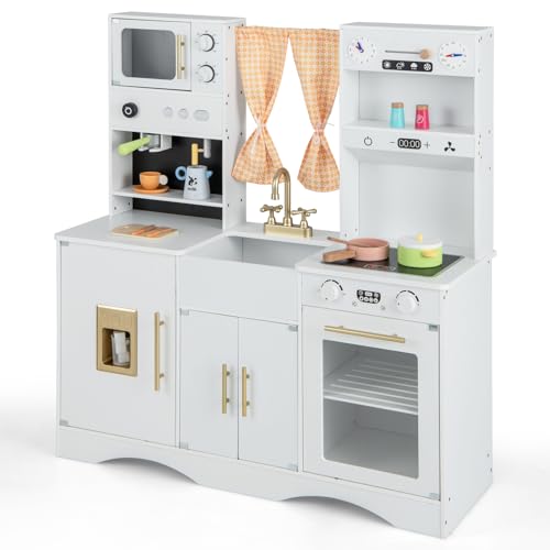 COSTWAY Barnkök trä, lekkök med ljus och ljud, lekköksset med spis, mikrovågsugn, ugn, ismaskin, telefon, klocka, diskbänk, redskap, leksakskök för barn från 3 år