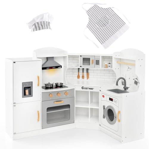 COSTWAY Hörnlekkök, barnkök med ljus och ljud, barnkök med diskbänk, ismaskin, ugn, köksredskap, träkök, leksakskök för barn från 3 år (vit)