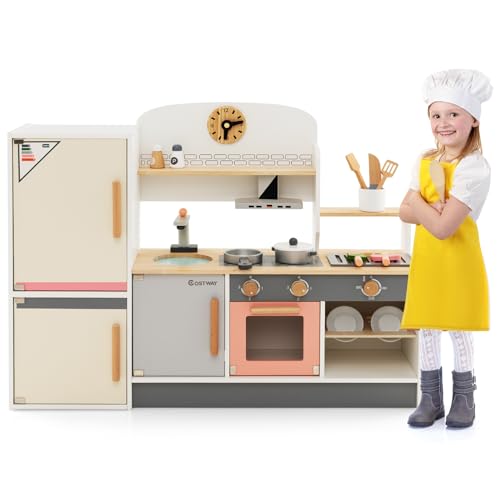 COSTWAY Barnkök med 16 lektillbehör, lekkök trä inkl. köksfläkt och ismaskin, telefon och tvättmaskin och mikrovågsugn, leksakskök för barn från 2 år, rosa (83 x 29 x 103 cm)