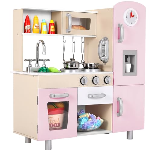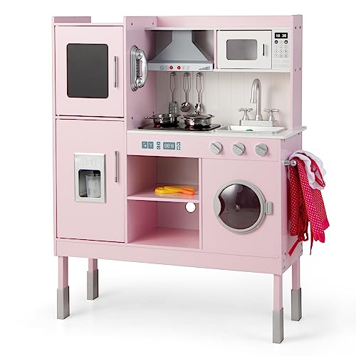 COSTWAY Barnkök med 16 lektillbehör, lekkök trä inkl. köksfläkt och ismaskin, telefon och tvättmaskin och mikrovågsugn, leksakskök för barn från 2 år, rosa (83 x 29 x 103 cm)