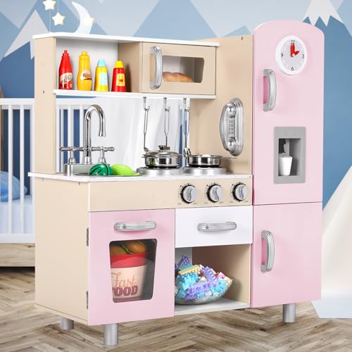 Barnkök, Träleksakskök, Träkök 81x74x30 cm, med Simulerade Ljus- och Ljudeffekter, Träkök, Utrustat med Kökstillbehör, Leksakskök,Rosa