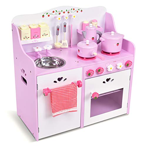 COSTWAY TP10029DE Barnkök med träköksredskap, lekkök med diskhanddukshållare och handduk, barnlekkök rosa, leksakskök för småbarn
