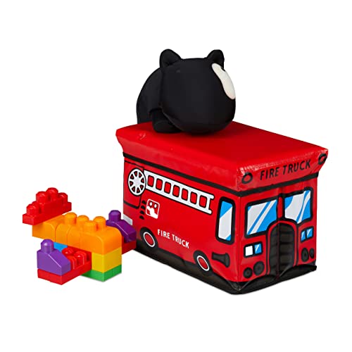 Relaxdays leksakslåda vikbar, brandkår, förvaringslåda med förvaringsutrymme och lock, vadderad, HBT 27 x 40 x 25 cm, röd