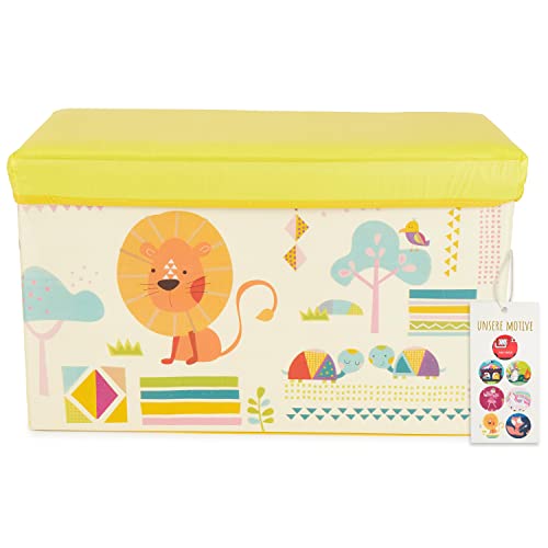 Bieco Förvaringslåda med lock, Zoo-motiv, hopfällbar, sittpuff med förvaring, leksakslåda, sittbänk, pojkar & flickor, 66 L, tål 80 kg, gul