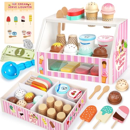 Dreamon glassbar barn trä, köpbutik tillbehör Montessori leksak, EIS träleksak med leksakspengar mynt, glassbutik barn rollspel, gåva 3-4 år flicka pojke (glassbar plus)
