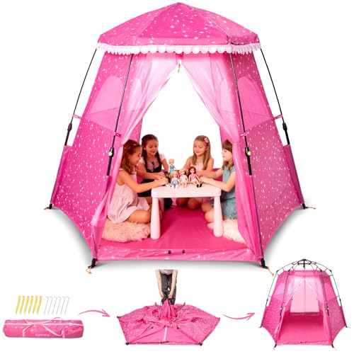 Funsland Prinsesstält för inomhusbruk, stora rosa stjärnor, popup-lektält för flickor, 200 x 99 x 135 cm, lektält för rum, lekstuga för barn, babytält utomhus, med gräsnaglar och