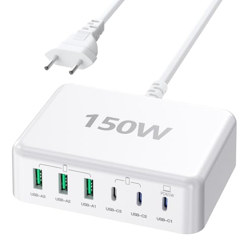 150W USBC Laddare, Multipel 6-i-1(3USBA+3USBC) GaN USBC Laddningsstation med 65W Utgångsport för MacBook Pro/Air, Lenovo, HP, USBA Nätadapter Snabbladdare med QC3.0 för i Phone, Samsung, iPad