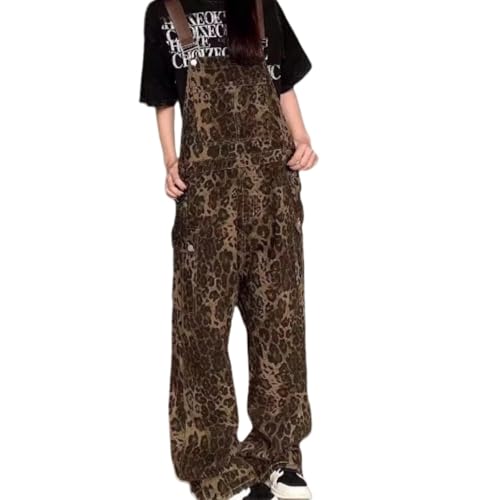 Leopardtryck overaller för kvinnor rakt brett ben denim jumpsuit justerbara remmar haklapp retro hip hop lösa byxor, Leopard, XL