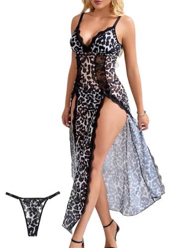 ohyeahlady Babydoll dam lång sexig spets + mesh plusstorlek lång split nattlinne chic outfit sexig varm nattkläder chic pyjamas set underkläder och kläder, Leopard, XL