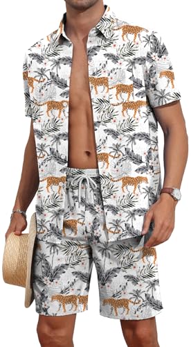 AIYINO Hawaiiansk skjorta och shorts för män set shiteshirts för sommarsemester funky stranddräkter, Vit leopard, XL