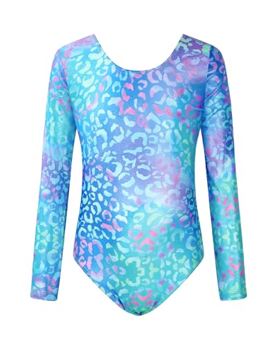 JiAmy Gymnastikdräkt för flickor, långärmad, barn, glitter, gymnastik, gymnastikdräkt, leotard dancewear, gymnastikbody för 3–12 år, Blå leopard, 9-10 år