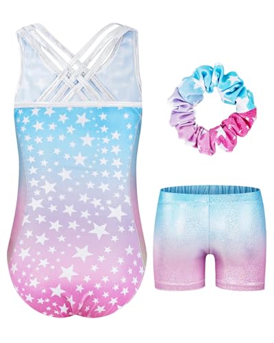 JiAmy Gymnastikdräkt för flickor, barn, glitter, gymnastik, gymnastikdräkt, leotard med strass-stenar set för 3–12 år, Blå-rosa stjärnor, 8-9 År