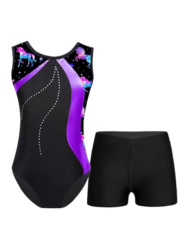 Miaeowve Barn-gymnastikdräkt, gymnastiktröja, klassisk gymnastikdräkt, ärmlös, body, leotard med dans, shorts, gymnastikshorts, träningsshorts, danskläder, violett, 134-140