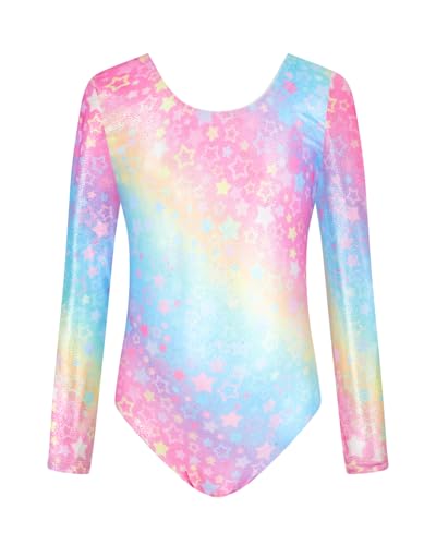 JiAmy Gymnastikdräkt för flickor, långärmad, barn, glitter, gymnastik, gymnastikdräkt, leotard dancewear, gymnastikbody för 3–12 år, Färgglad stjärna, 5-6 år