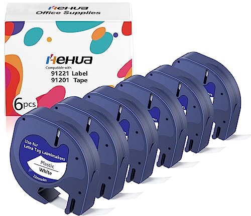 6x Hehua Ersättning för Dymo Letratag 91221 91201 S0721660 Etikettband Plast Svart på vitt, Kompatibel med Dymo letratag XR LT-100H LT110T LT-100T QX50 XR XM 2000 Plus 200B (12mm x 4m)