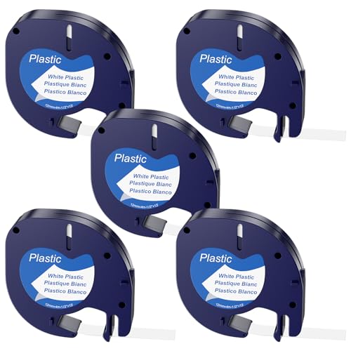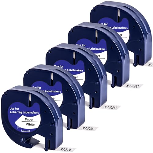 Yuanqimm Ersättning för Dymo Letratag 12mm x 4m Papper White Label Letra Tag 91220 91200 S0721510 Svart på Vitt Tape Kompatibel med Dymo Letratag LT-100H LT110T LT100T QX50 XR XM 2000 200b, 5-Pack