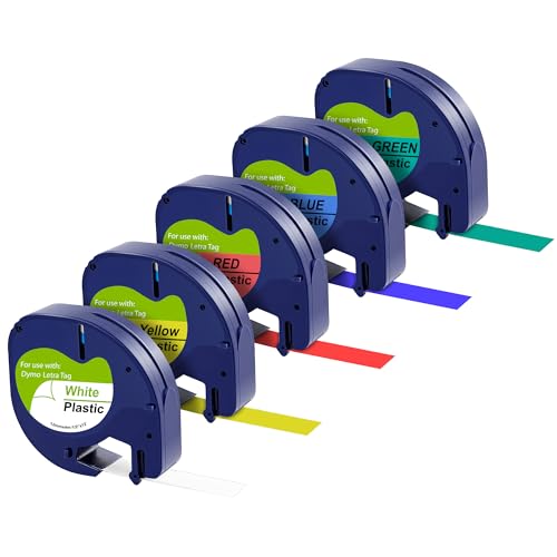 Set med 5 etiketter, vit/blå/gul/röd/grön för Dymo LetraTag LT-100H/LT-100T/2000/XM/XR/QX50, plastetikett refill 91201 91202 91203 91204 91205 12 mm x 4 m Phonillico®