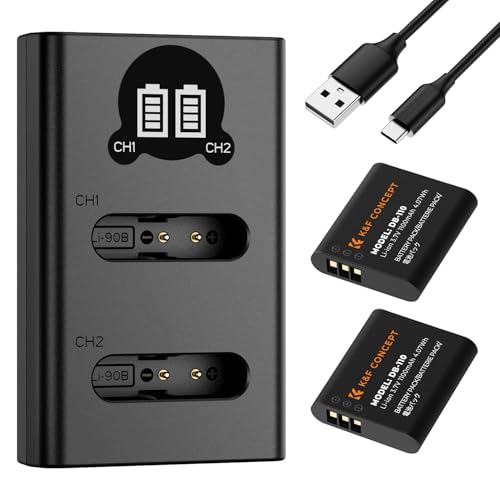 K&F Concept 2 batterier DB-110 + LCD-laddare med dubbla slitsar Kompatibel med Olympus TG7/6/5/4, Ricoh GR III, GR IIIx, Theta X, WG-6, G900, G900 II, G900SE II med Li-90B/Li-92B-batterier.