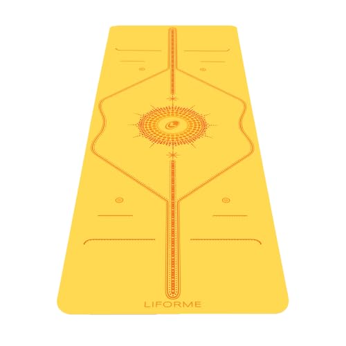 Liforme tryckt yogamatta samling – gratis yogaväska, patenterat justeringssystem, krigarliknande grepp, halkfri, miljövänlig, svettbeständig, lång, bred och tjock för komfort (strålande solgul)