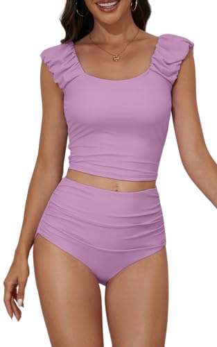 Eomenie Tankini Swimsuits for Women Ruched Tummy Control Bathing Suit Two Piece Swim Tank Top with High Waisted Bottom Light Purple