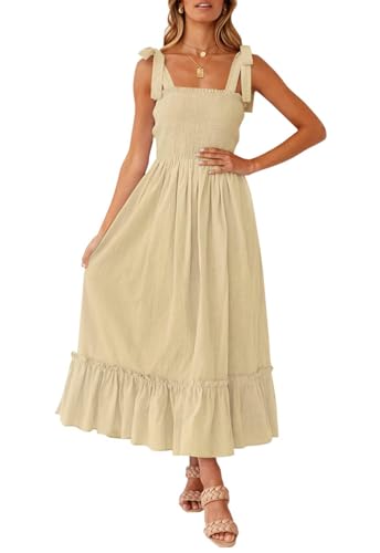 ZESICA Women's 2025 Summer Boho Spaghetti Strap Square Neck Solid Color Ruffle A Line Beach Long Maxi Dress,LightYellow,Medium